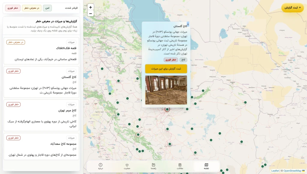 Mirase Iran is a community-driven, map-based platform designed to monitor, document, and help protect Iran’s cultural and natural heritage. The system provides an accessible and intuitive interface that enables users to explore the status of historical sites and natural environments across the country and report any threats or damage in real time.
